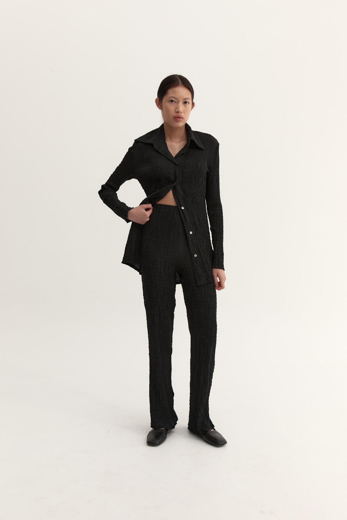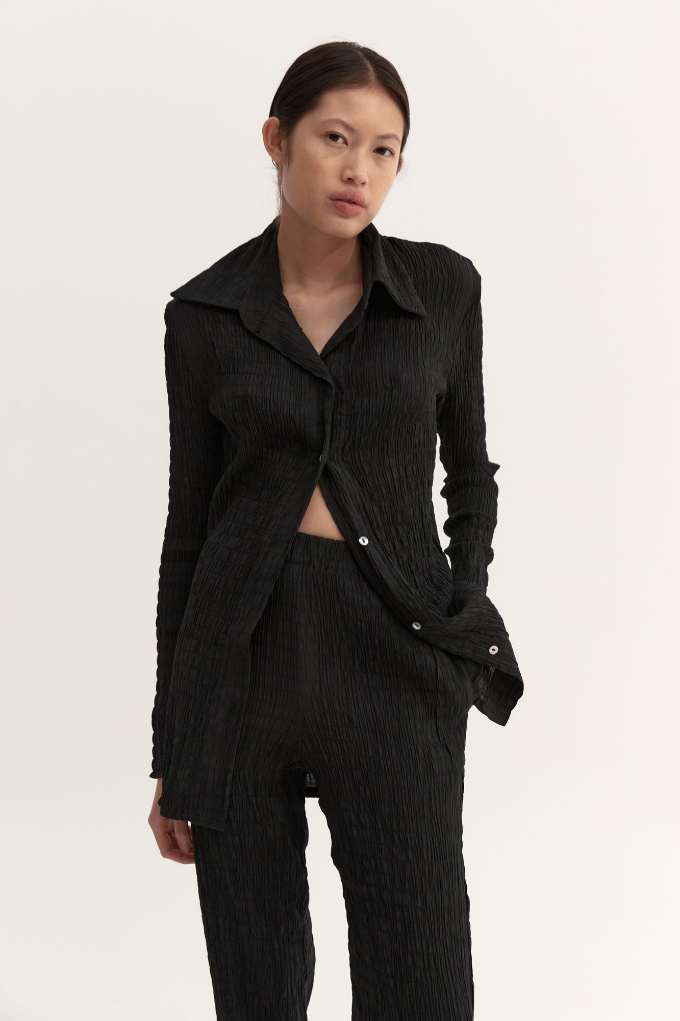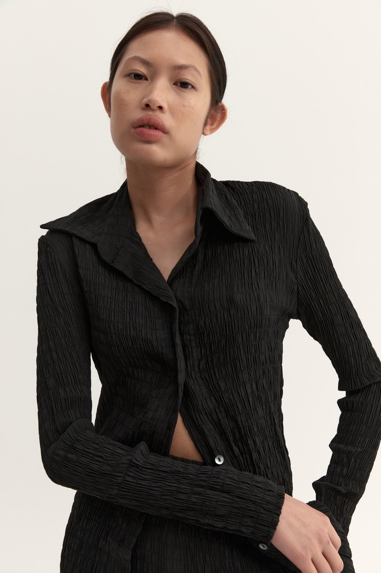 Our signature luxurious ruched fabrication, The Anastasia shirt is an elevated wardrobe piece.