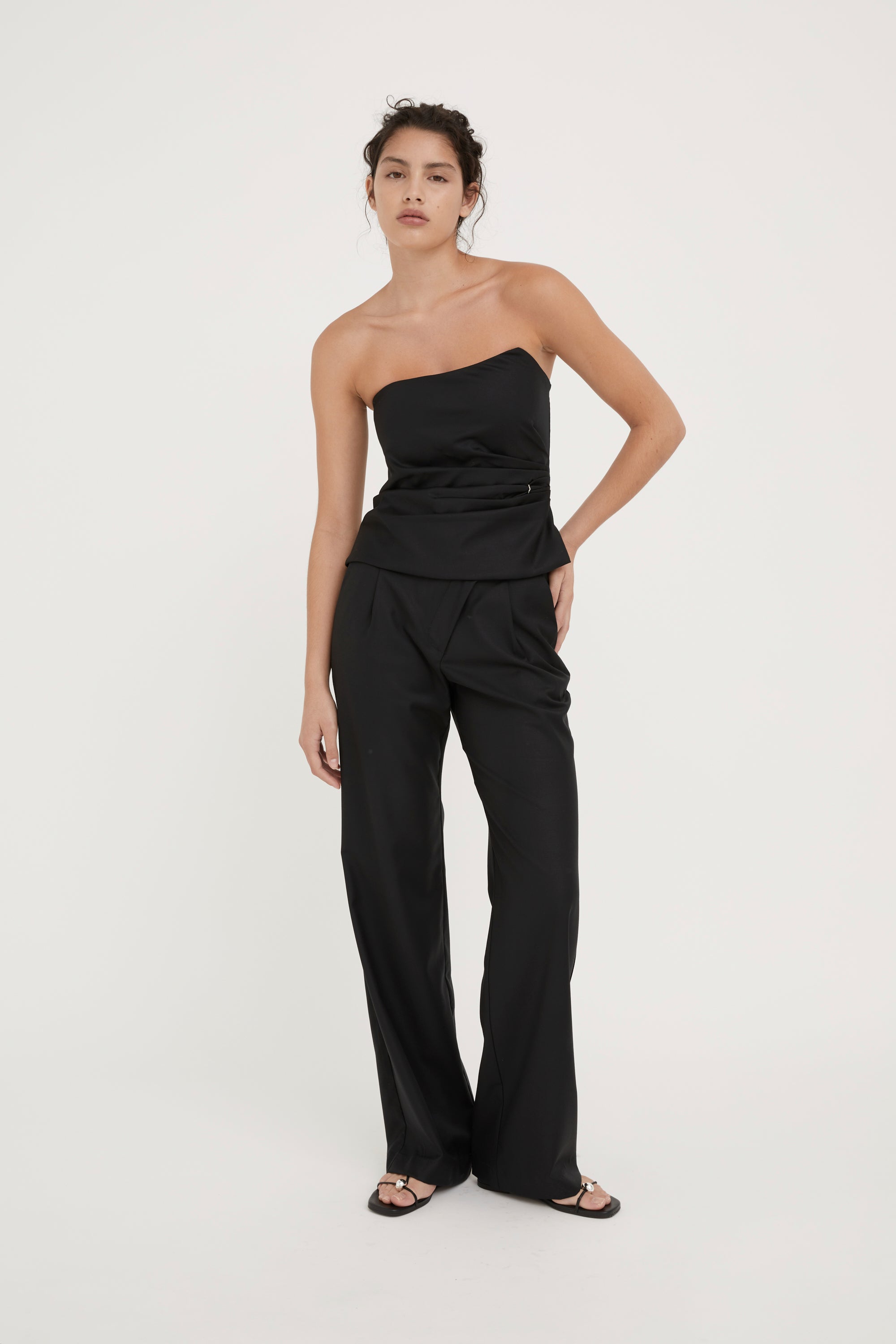The Fredericke wool bodice follows an asymmetrical strapless neckline with intricate pleat tuck side detailing and subtle silver jewellery accents.
