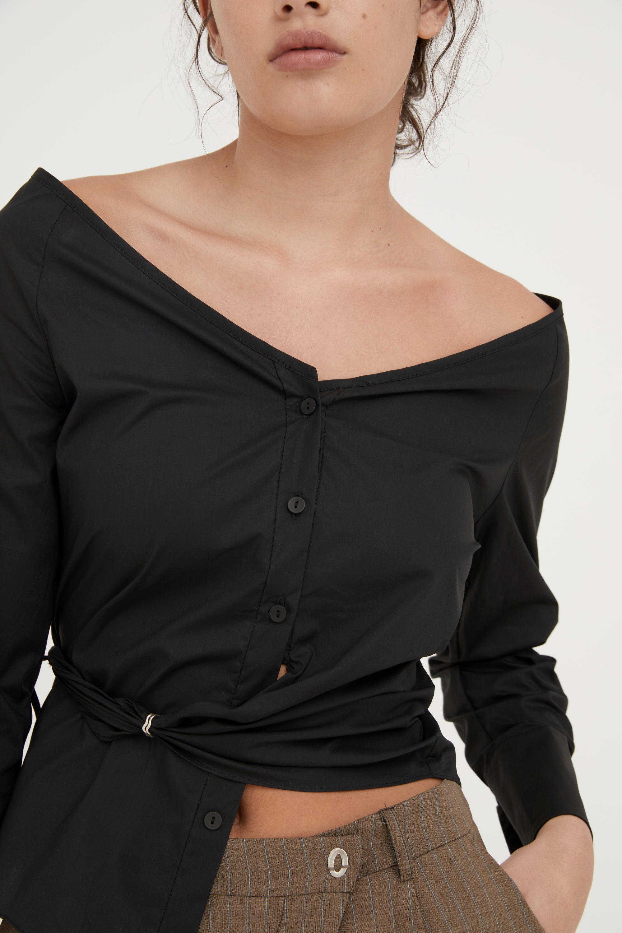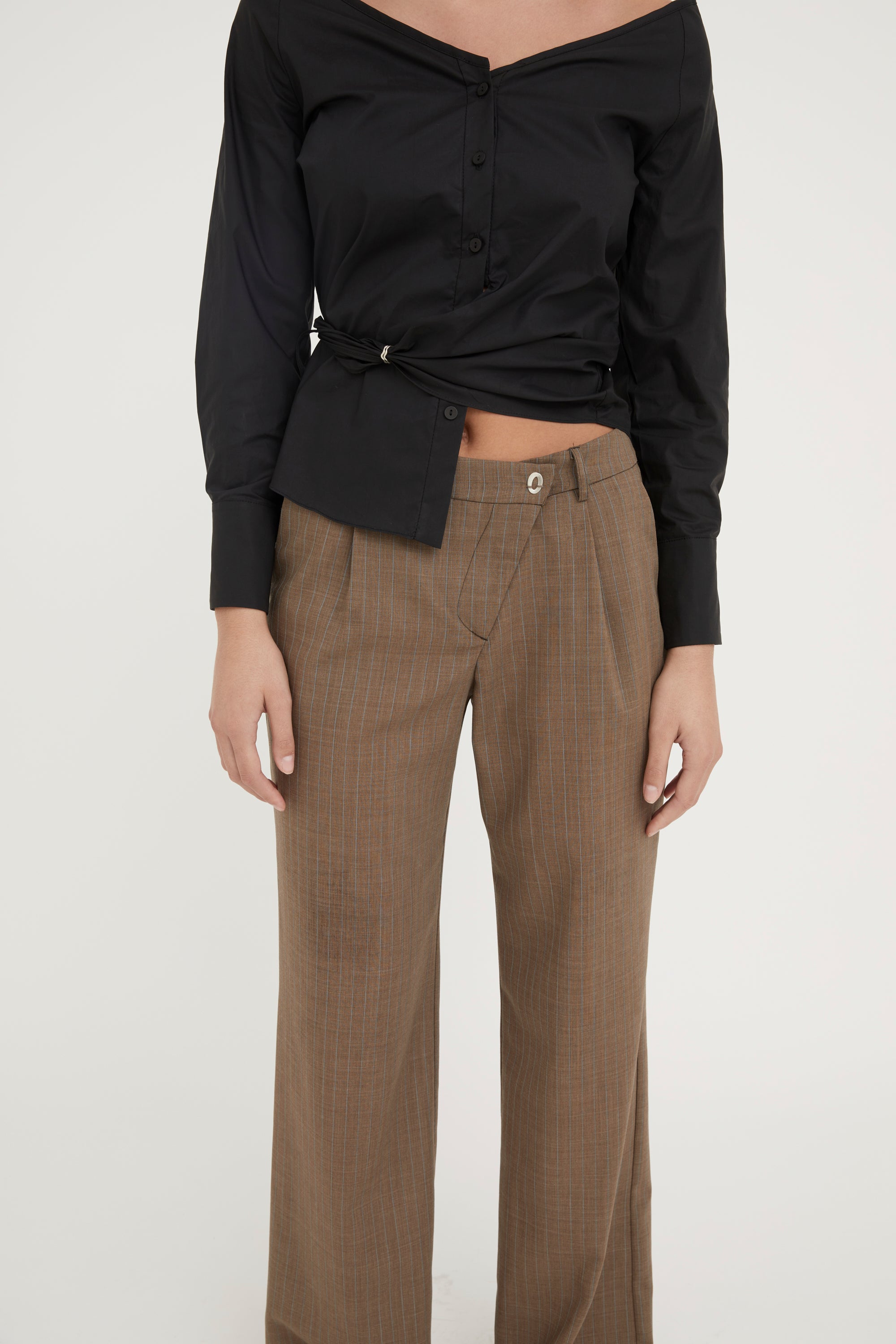 Low rise, relaxed fit, straight leg silhouette. Featuring an asymmetrical waistband with jewellery detailing, front pleats, belt loops, fly front zipper entry, side pockets, back welt pockets, darts and a blind hem finish.