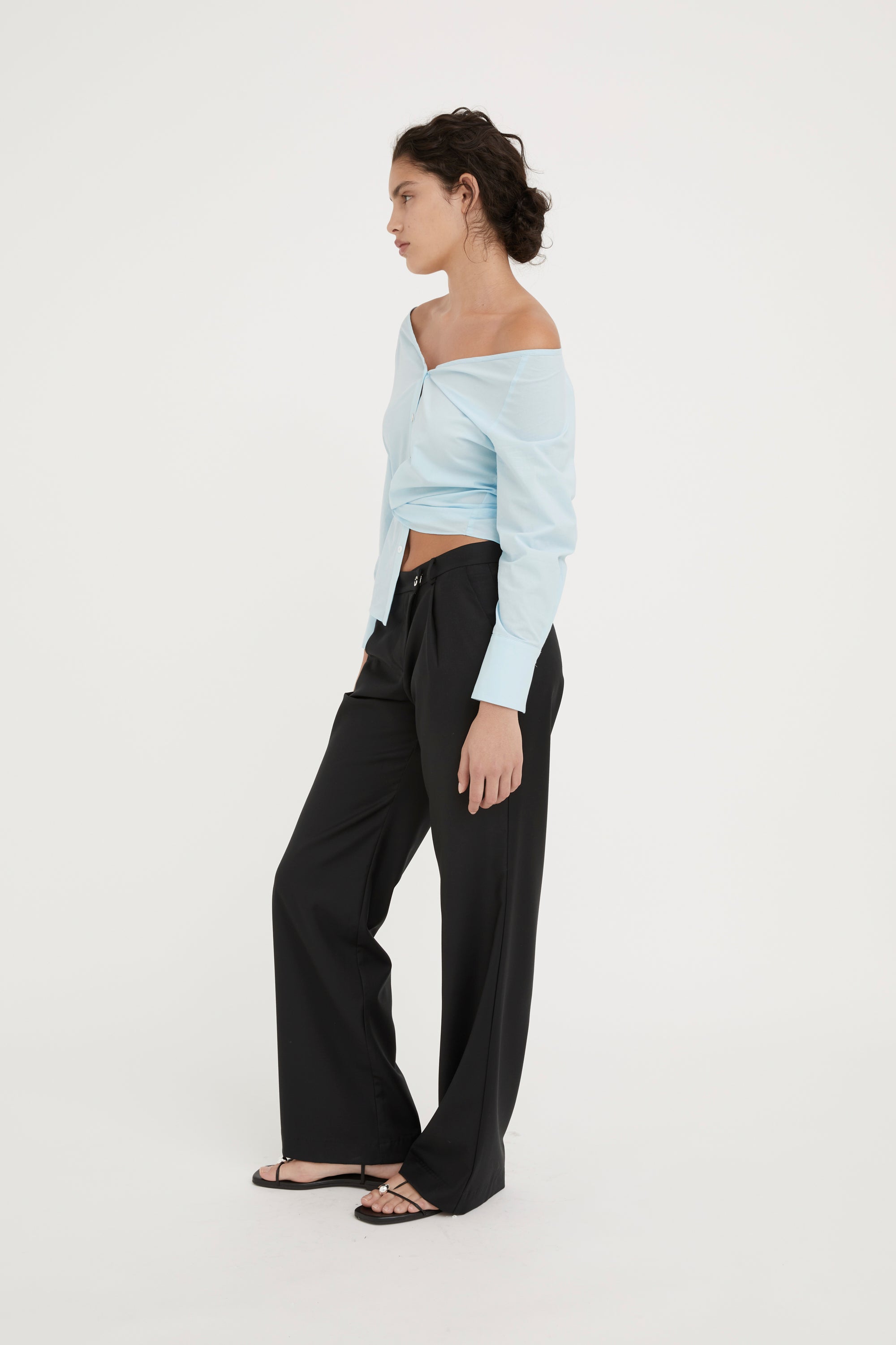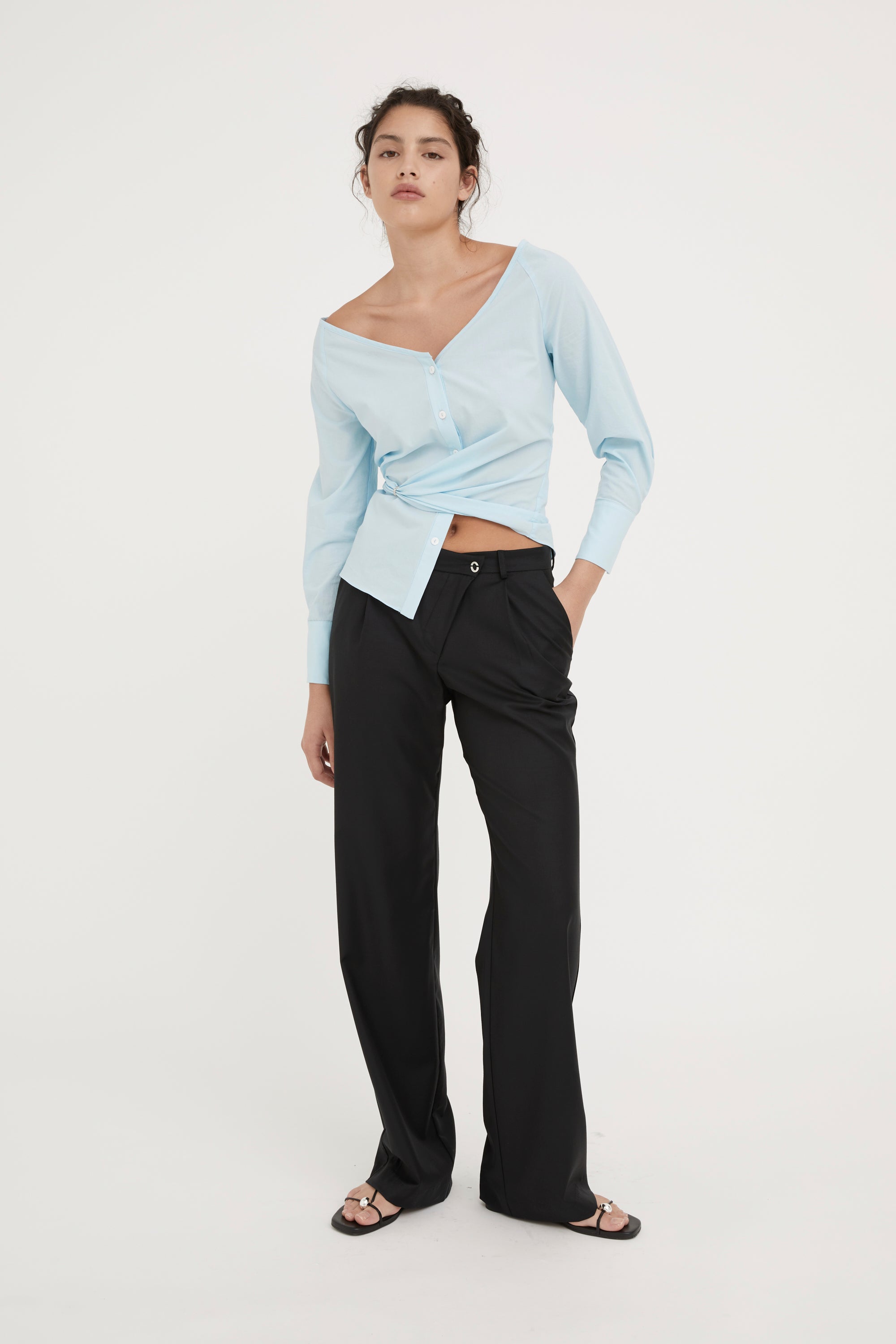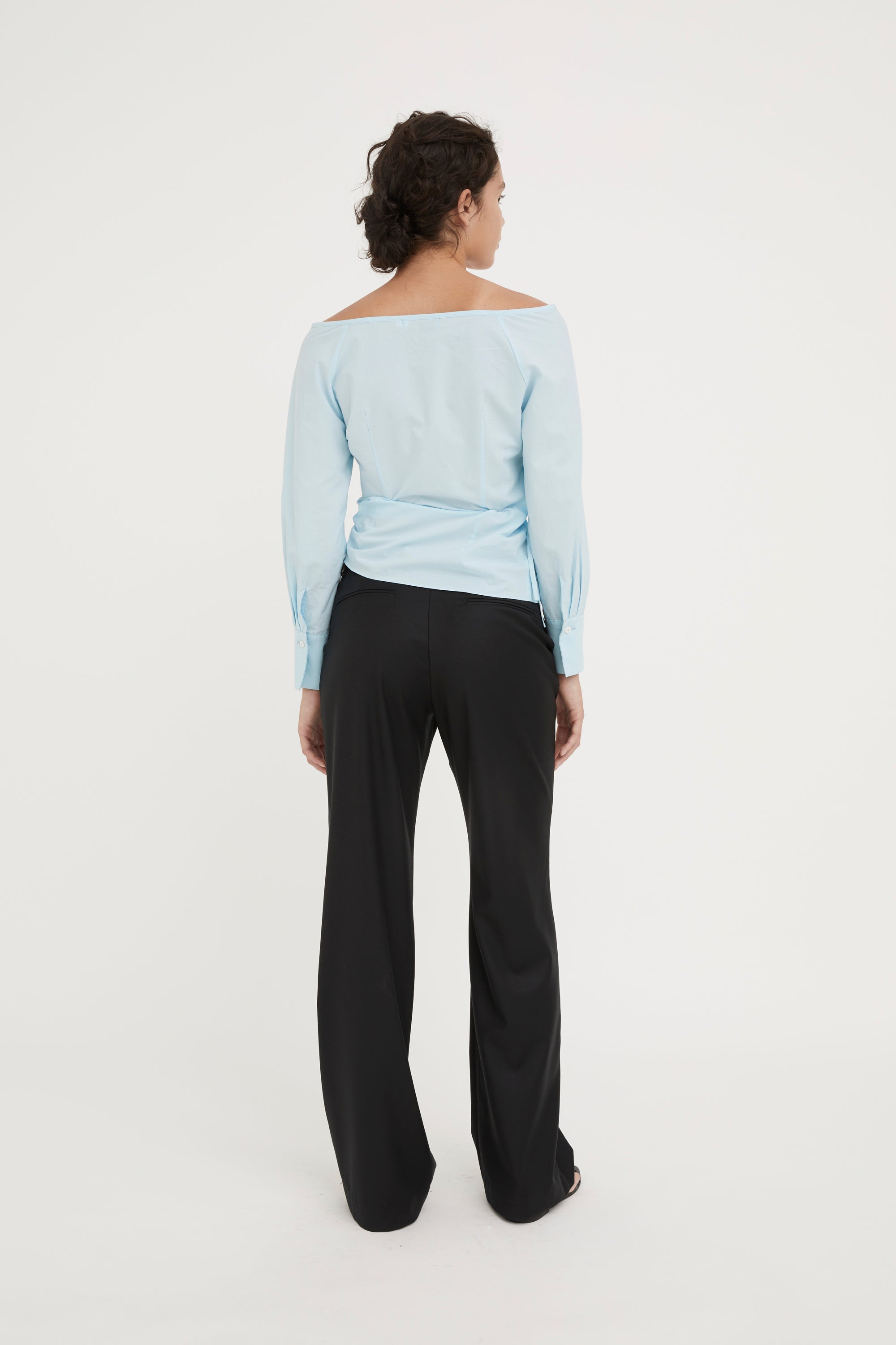 Off the shoulder silhouette with button down front, featuring an asymmetrical wrap tie panel at side seam and a silver jewellery feature. Straight sleeves, sleeve cuffs with pleating and button closure, back darting.