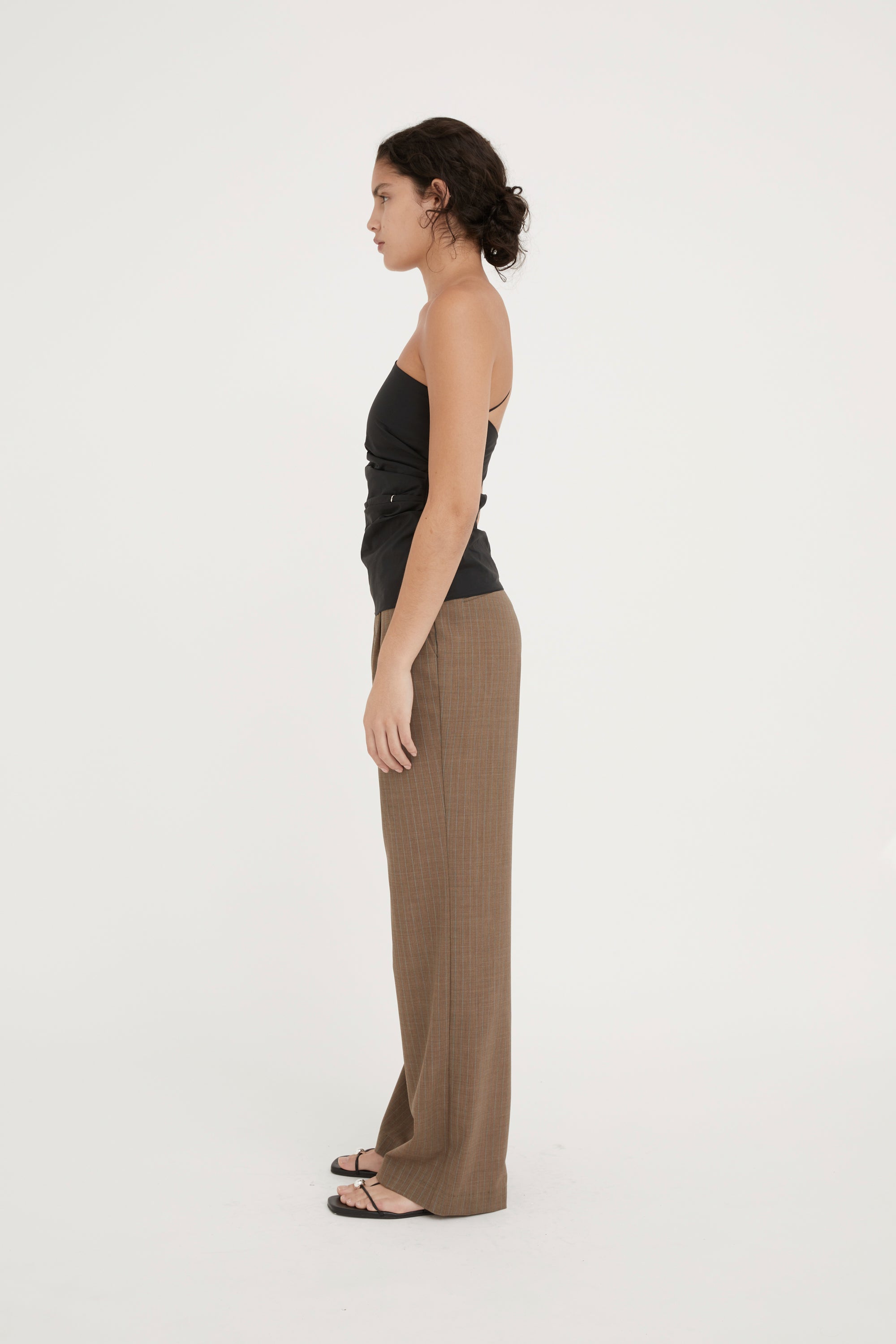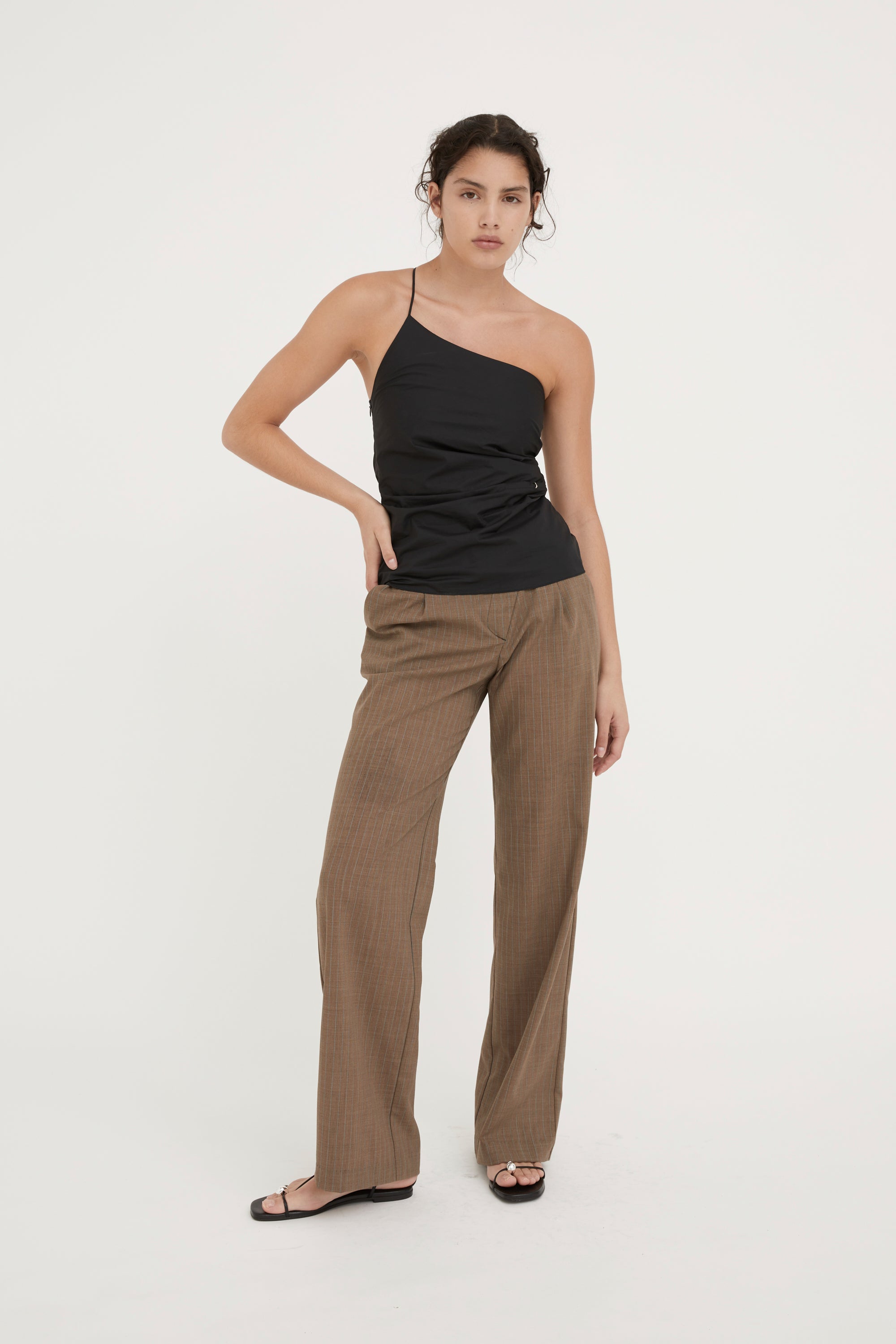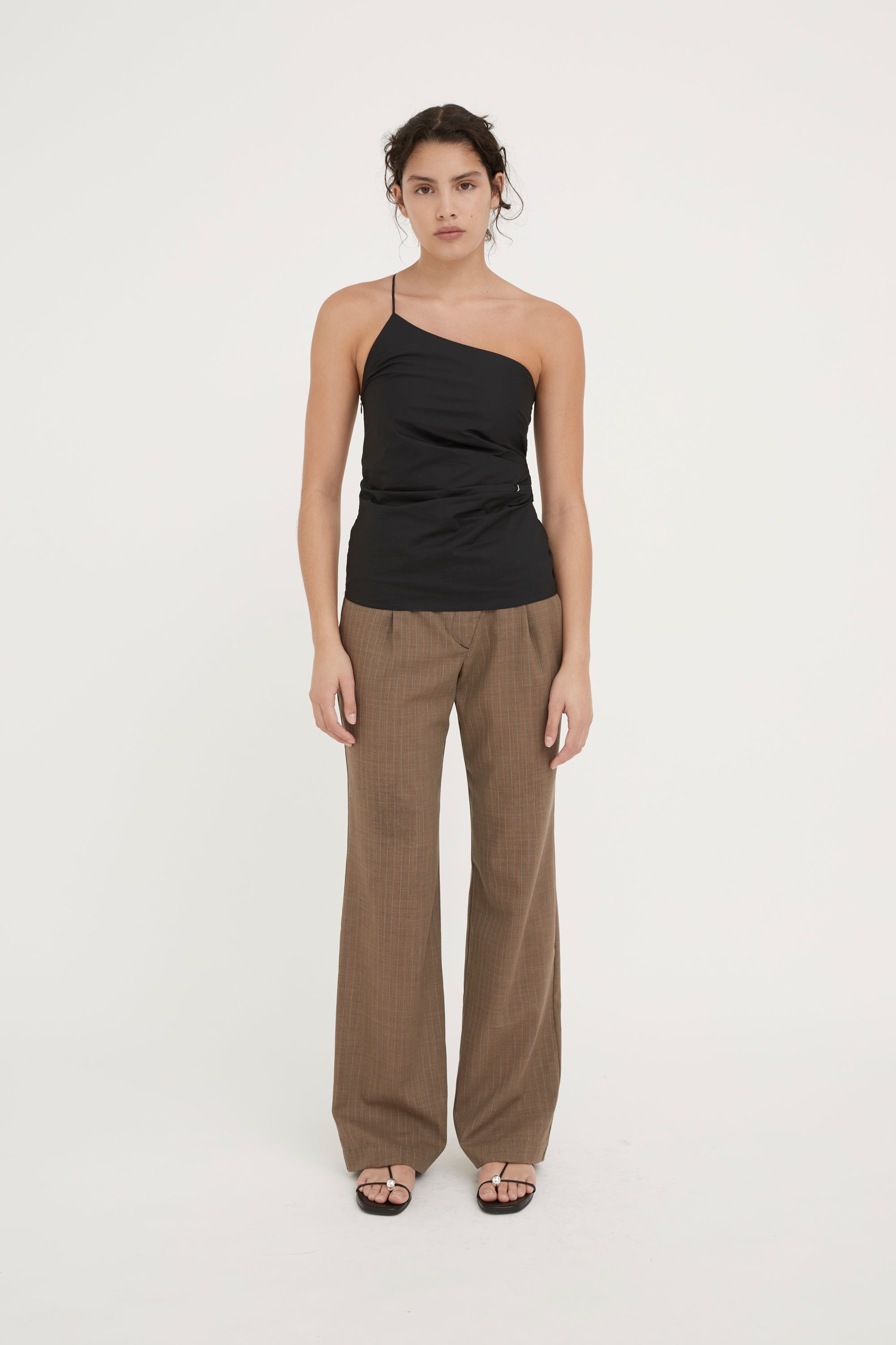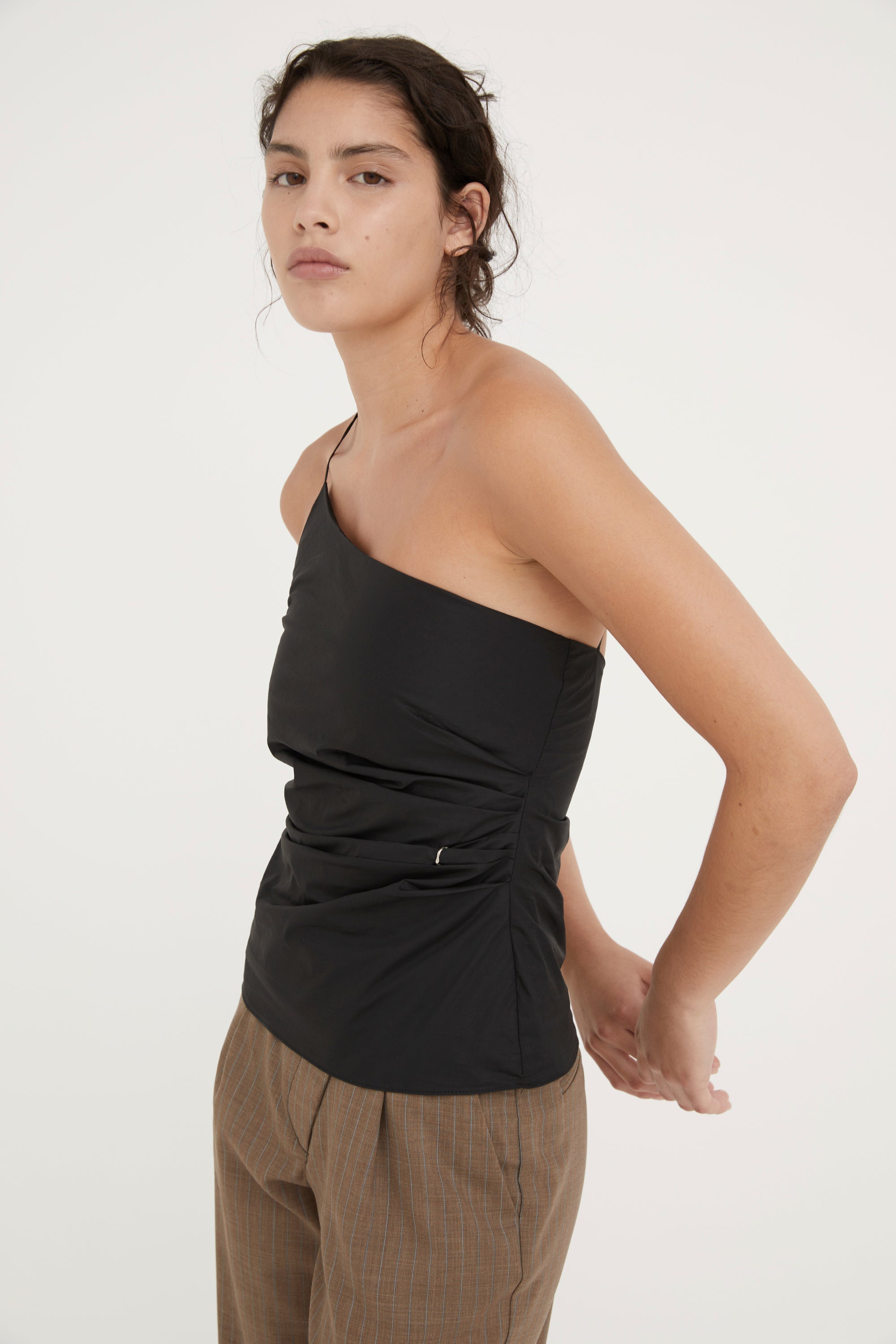 The Nicola cotton top is a fine strap, one shoulder silhouette crafted from 100% cotton. Featuring intricate pleat tucks to form a tailored fit with silver jewellery detailing. Fully lined garment in 100% cotton voile, invisible zipper entry at side seam and back darting.