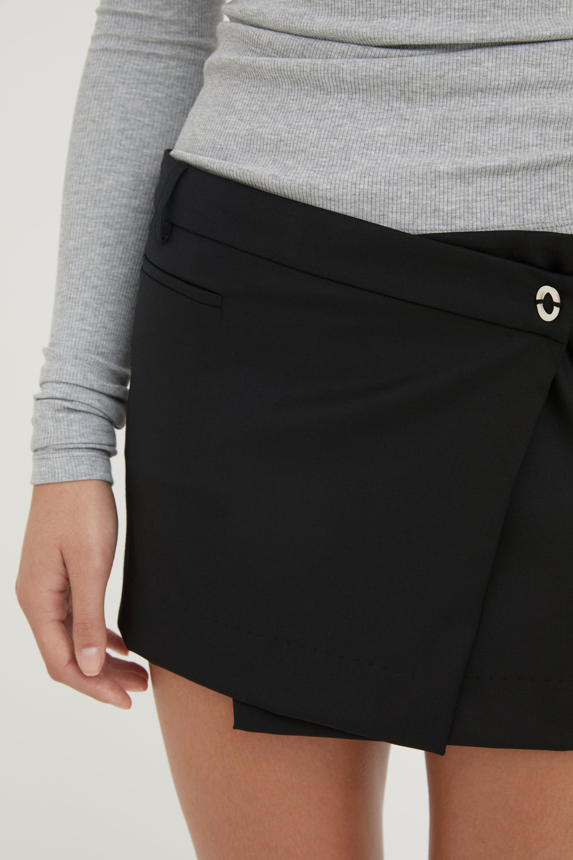 Tailored low rise mini skirt with an asymmetrical waistband and silver jewellery feature. Wrap skirt silhouette with button and clip closure, belt loops, front and back welt pockets, centre back seam, fully lined garment.