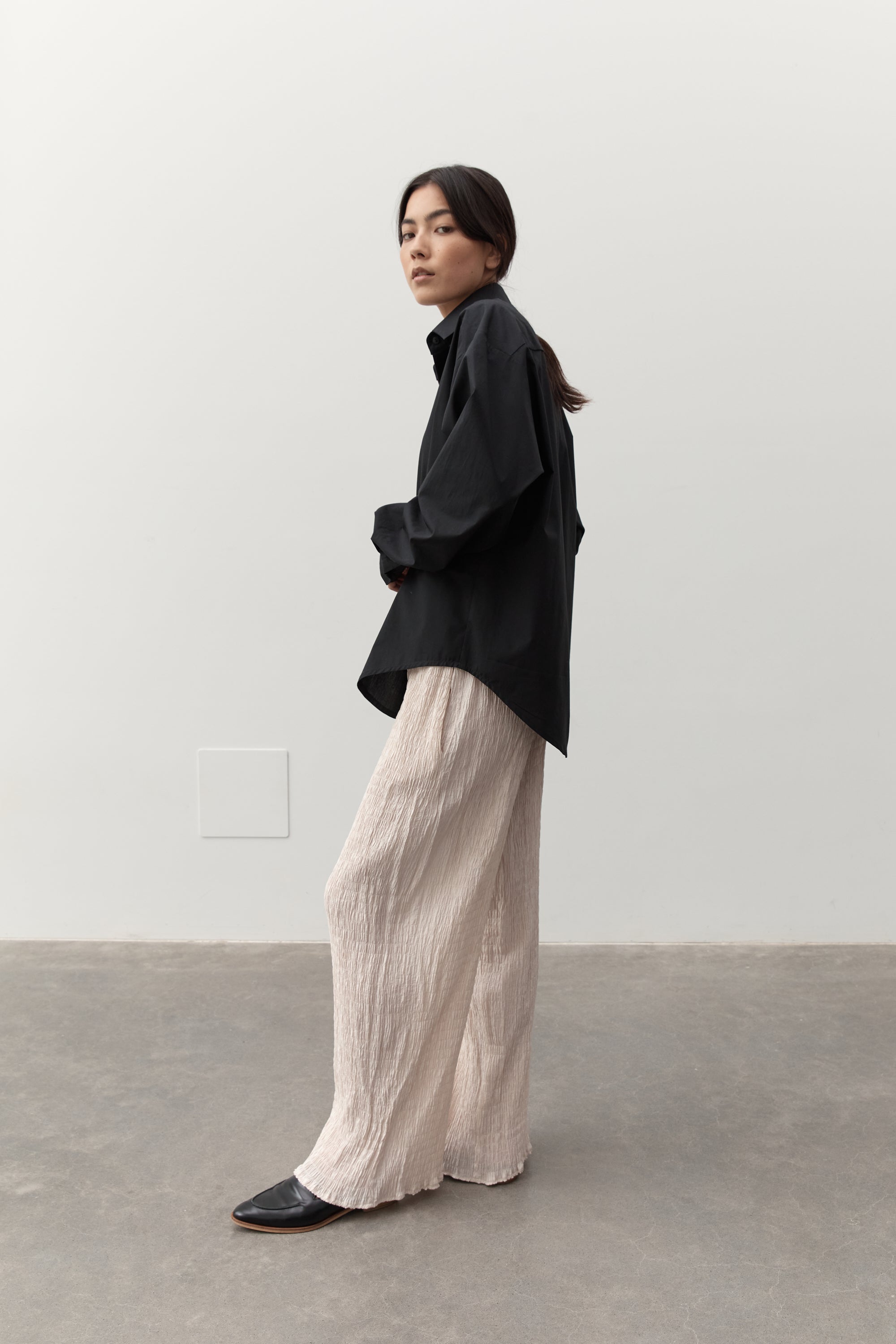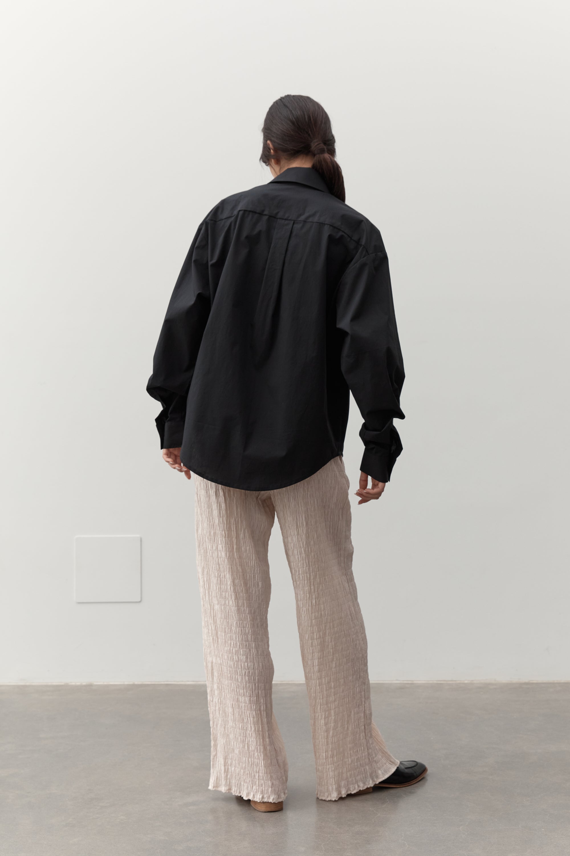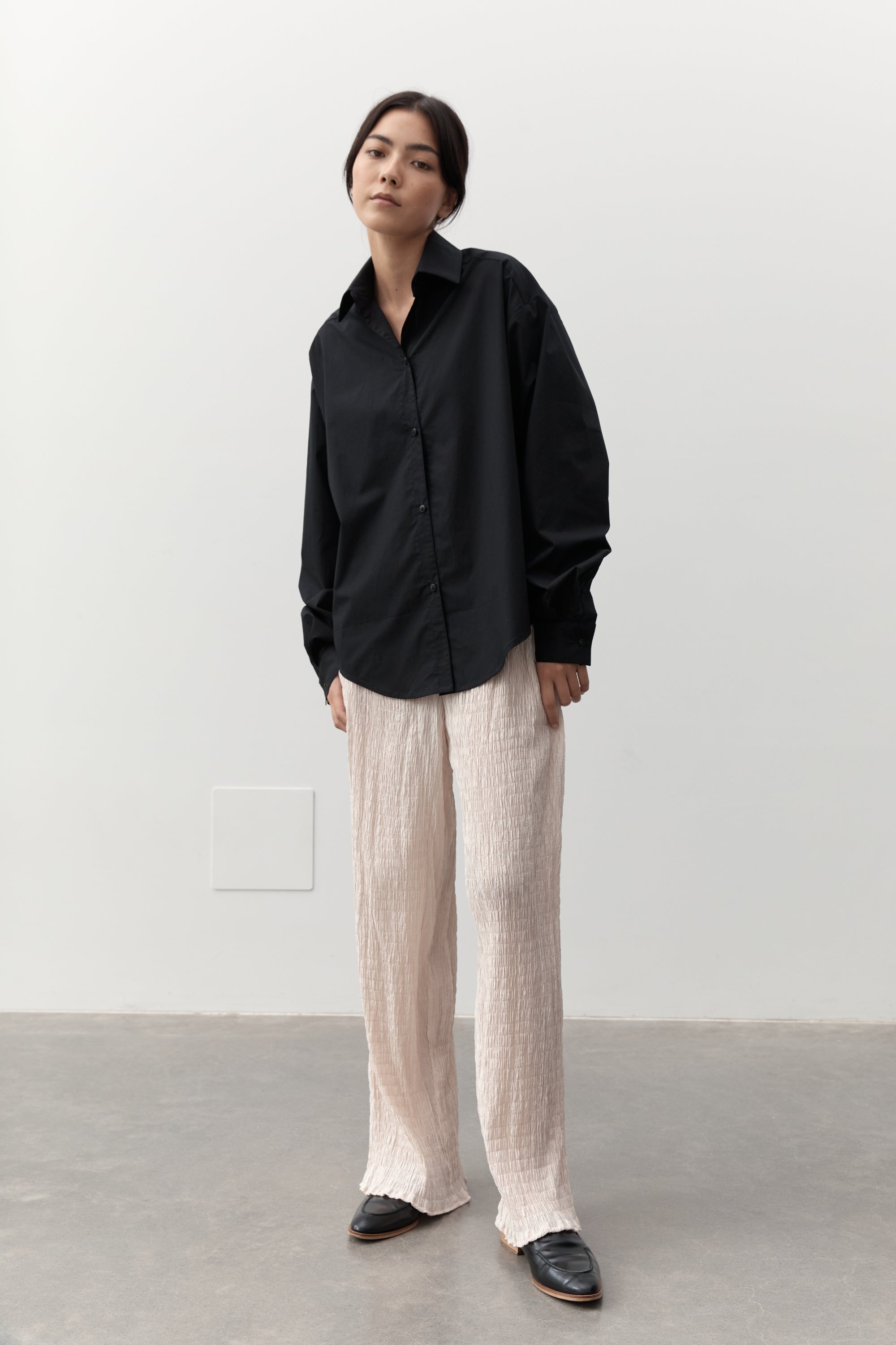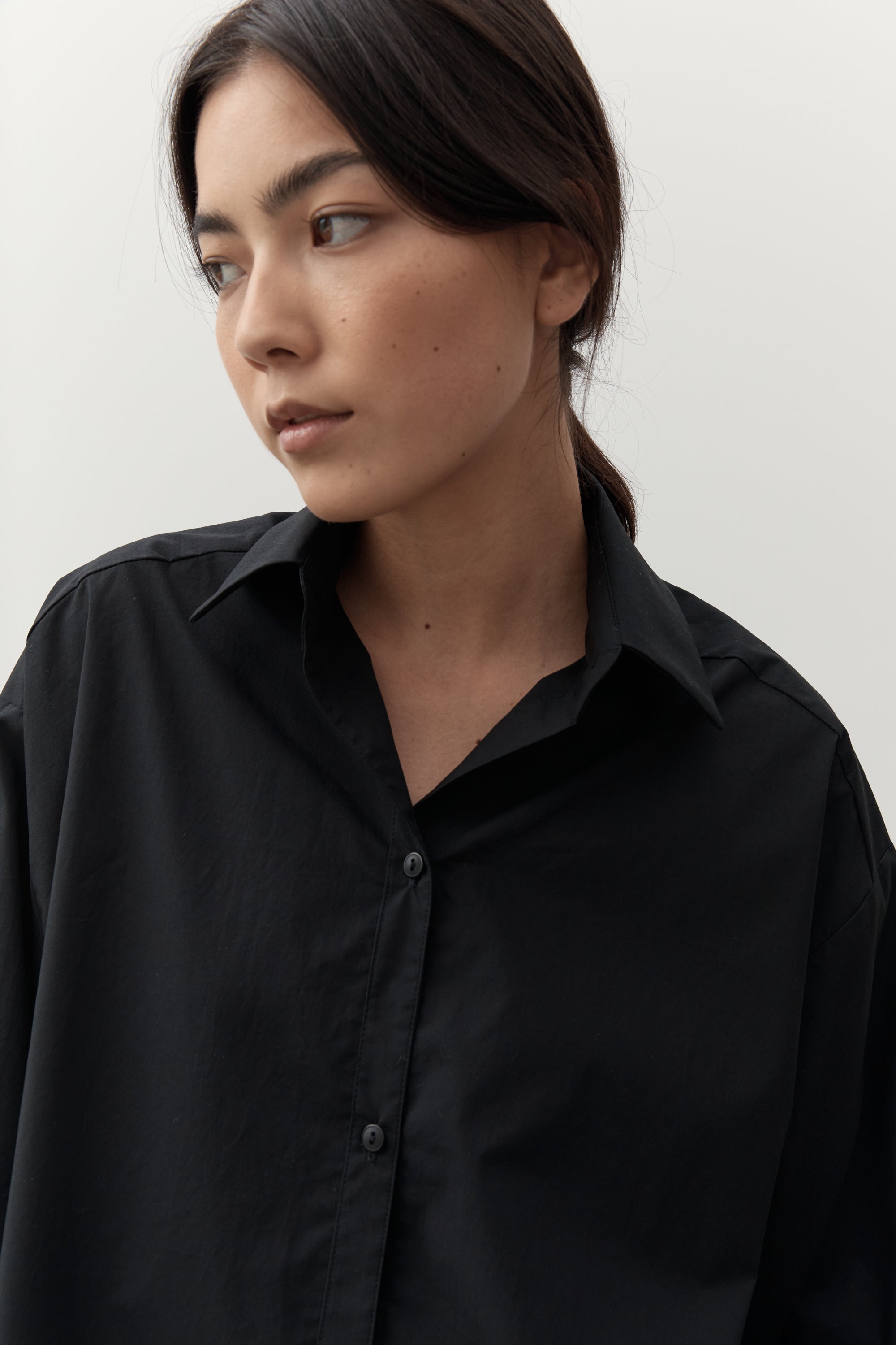 An elevated wardrobe essential, the classic shirt features an exaggerated fit with a button down front, classic shirt collar and sleeve cuffs and features exaggerated sleeve length detail.