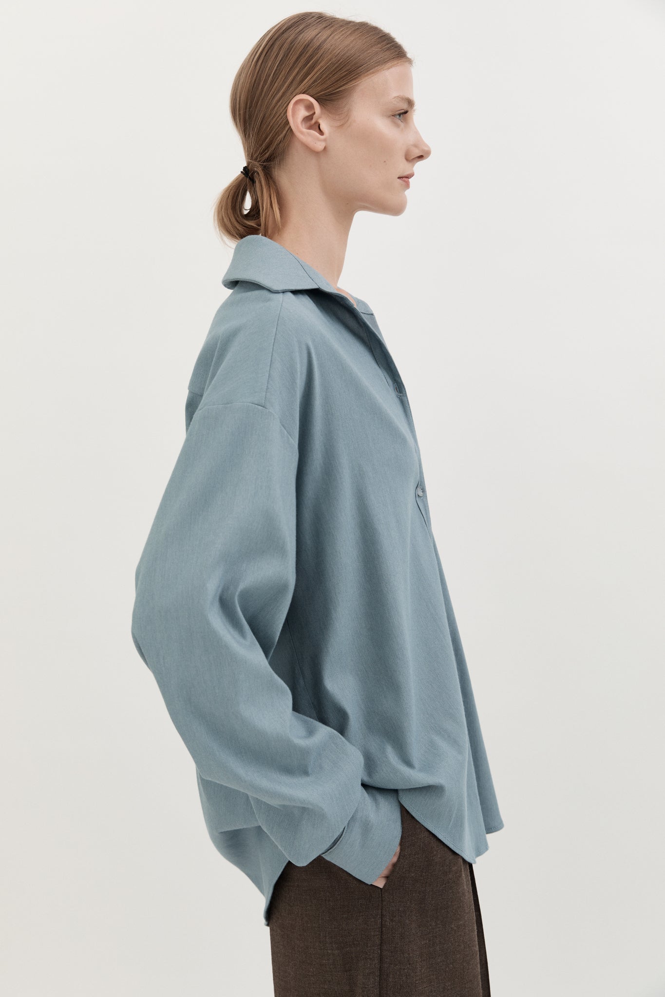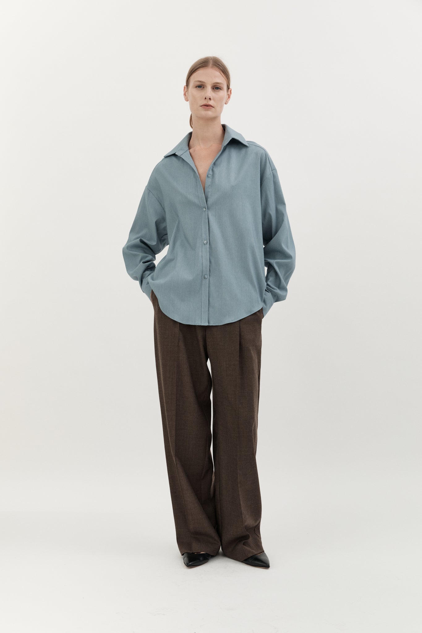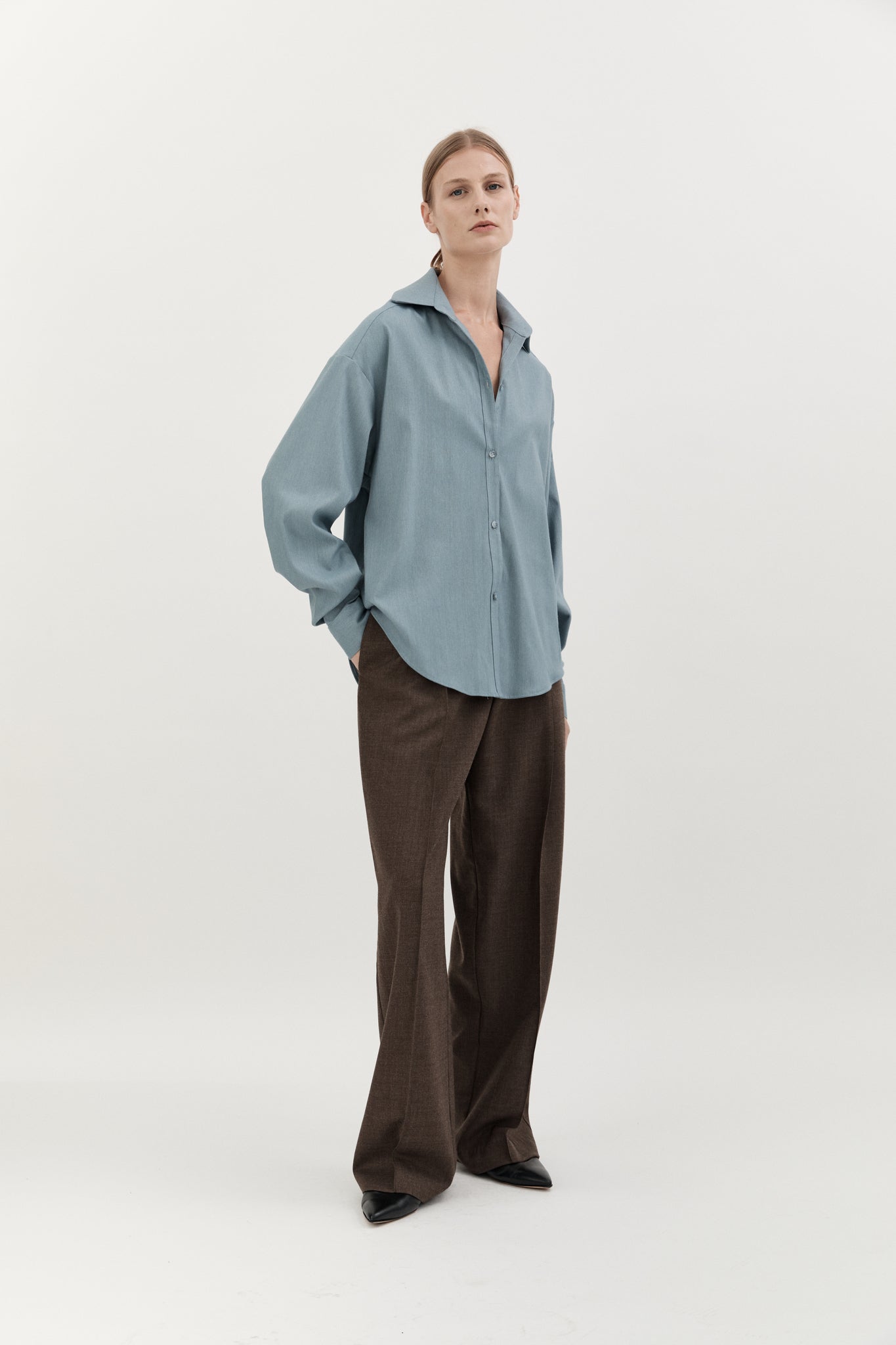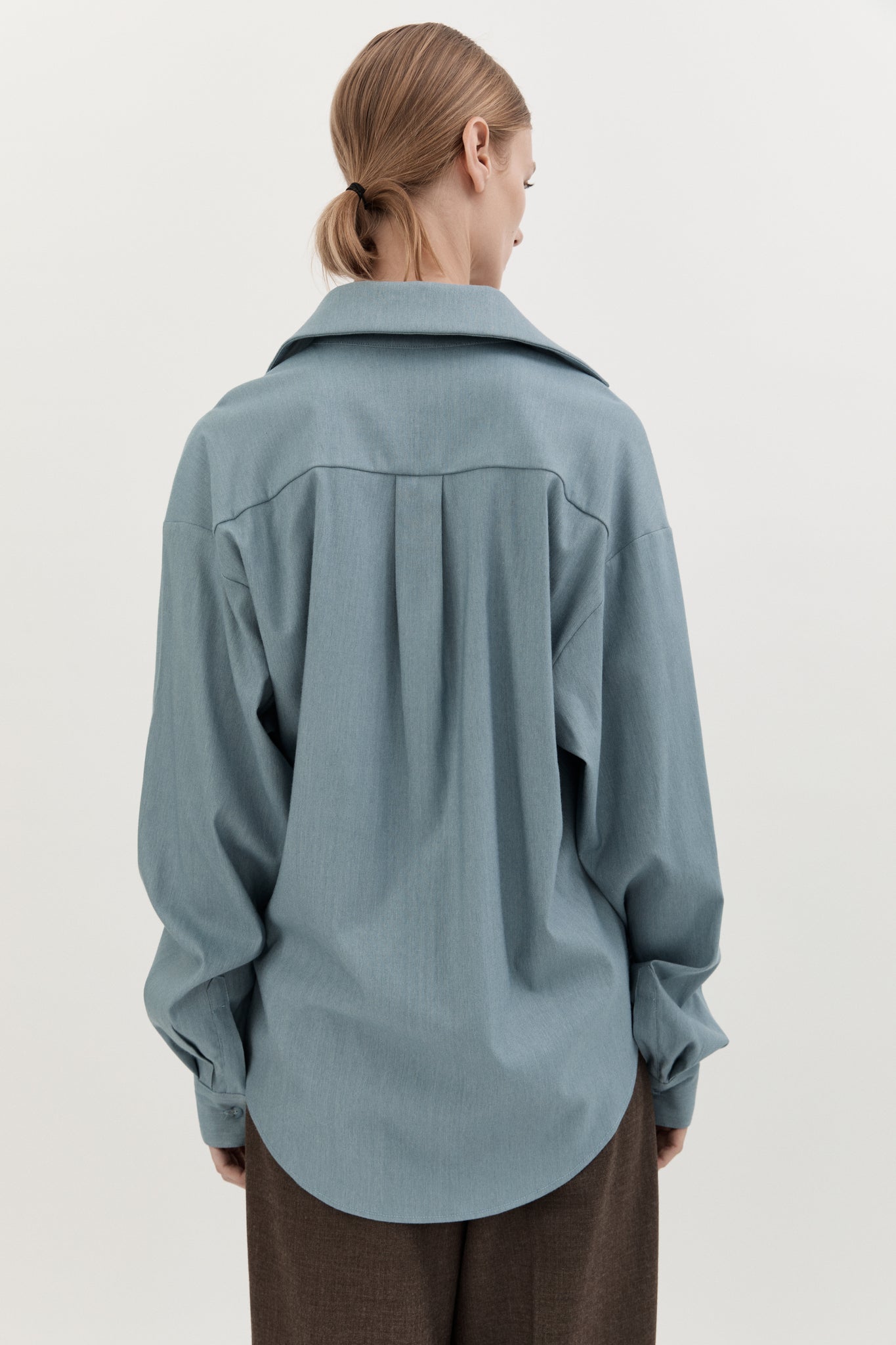 The classic shirt in sky is crafted from a soft wool blend fabrication.