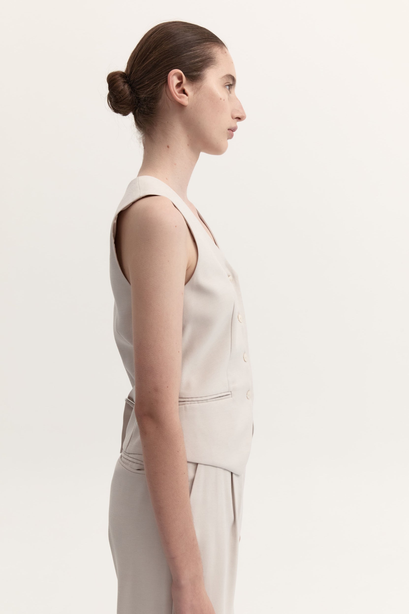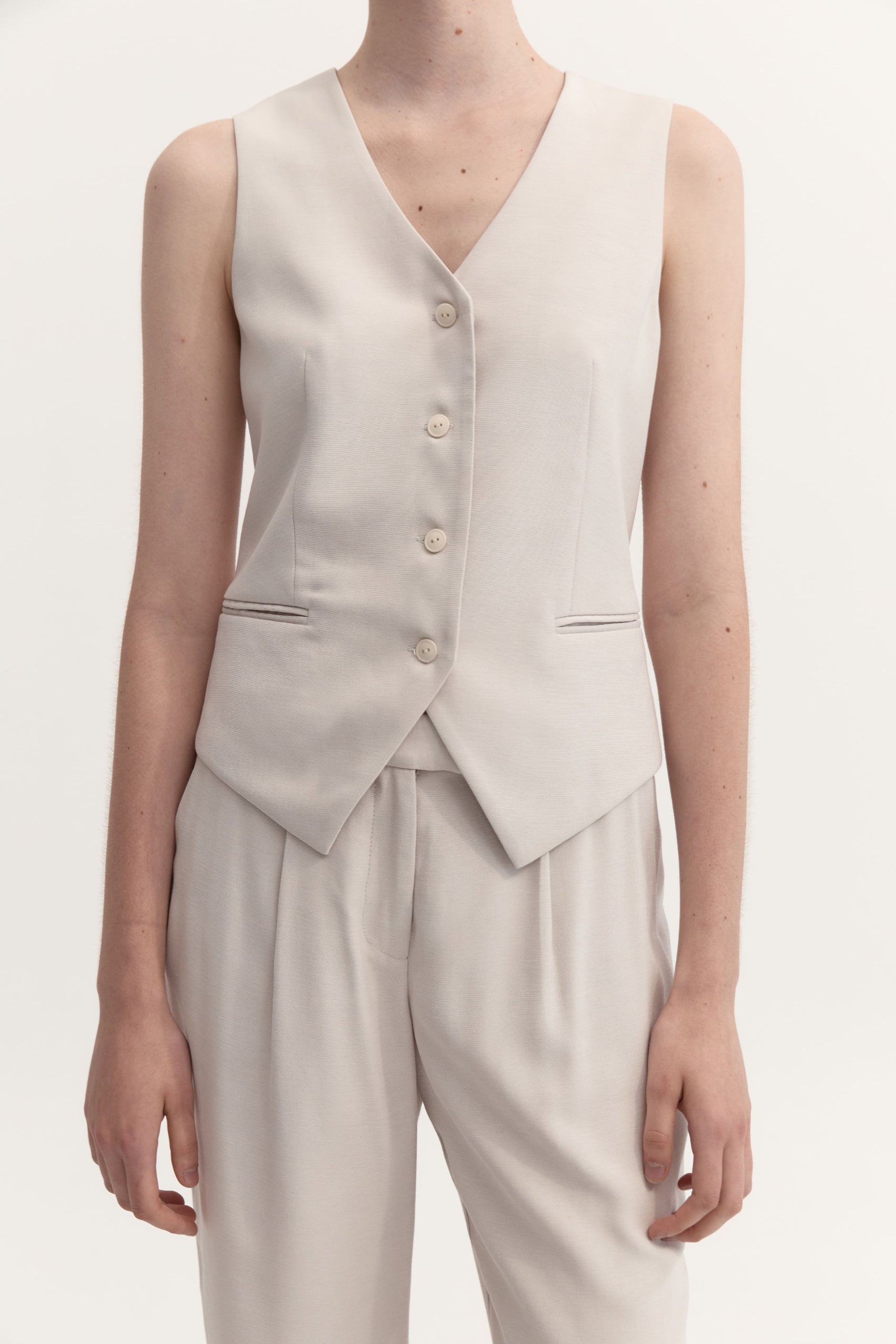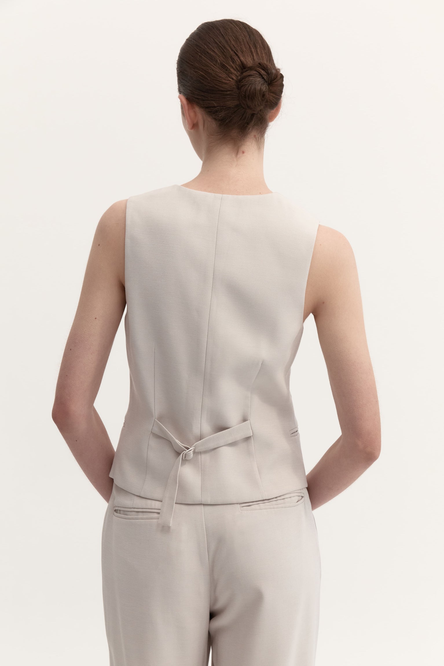 Classic tailored vest in a soft dove grey hue, crafted from a suiting blend fabrication.