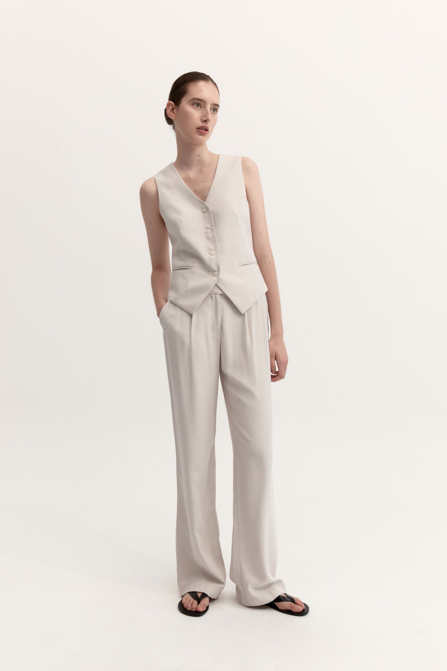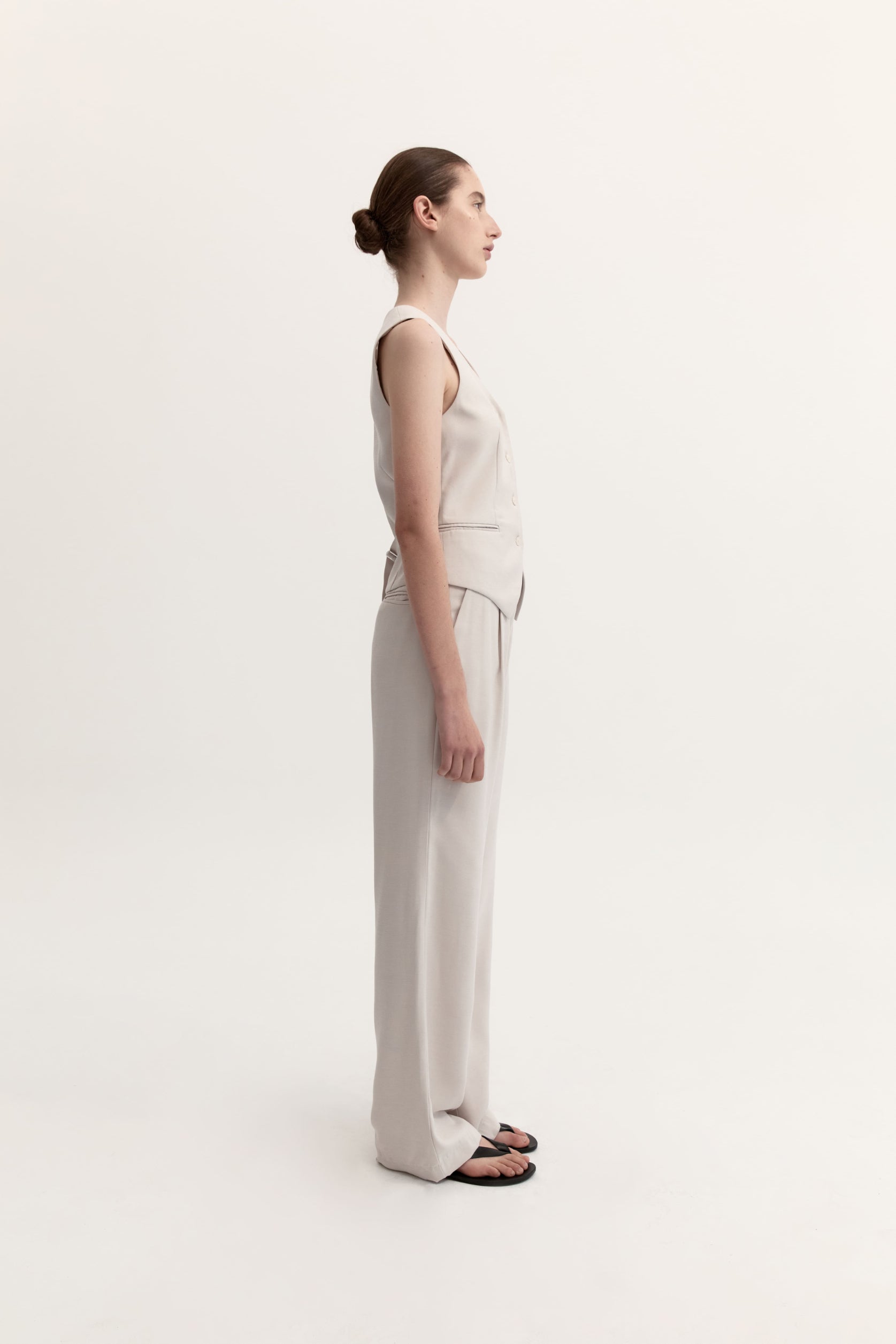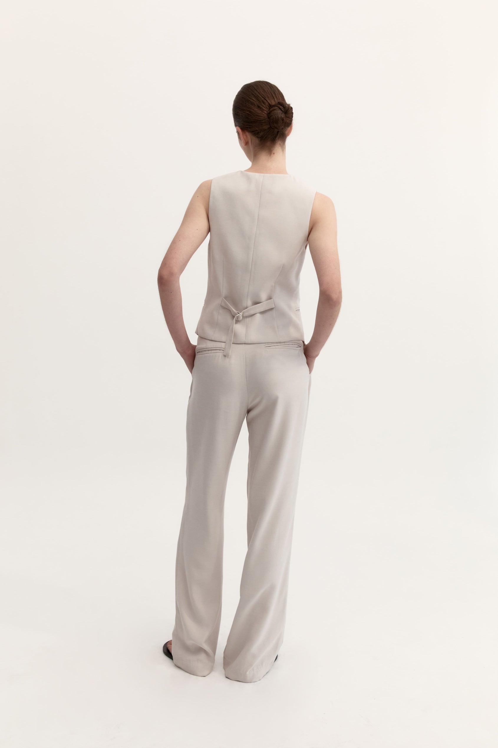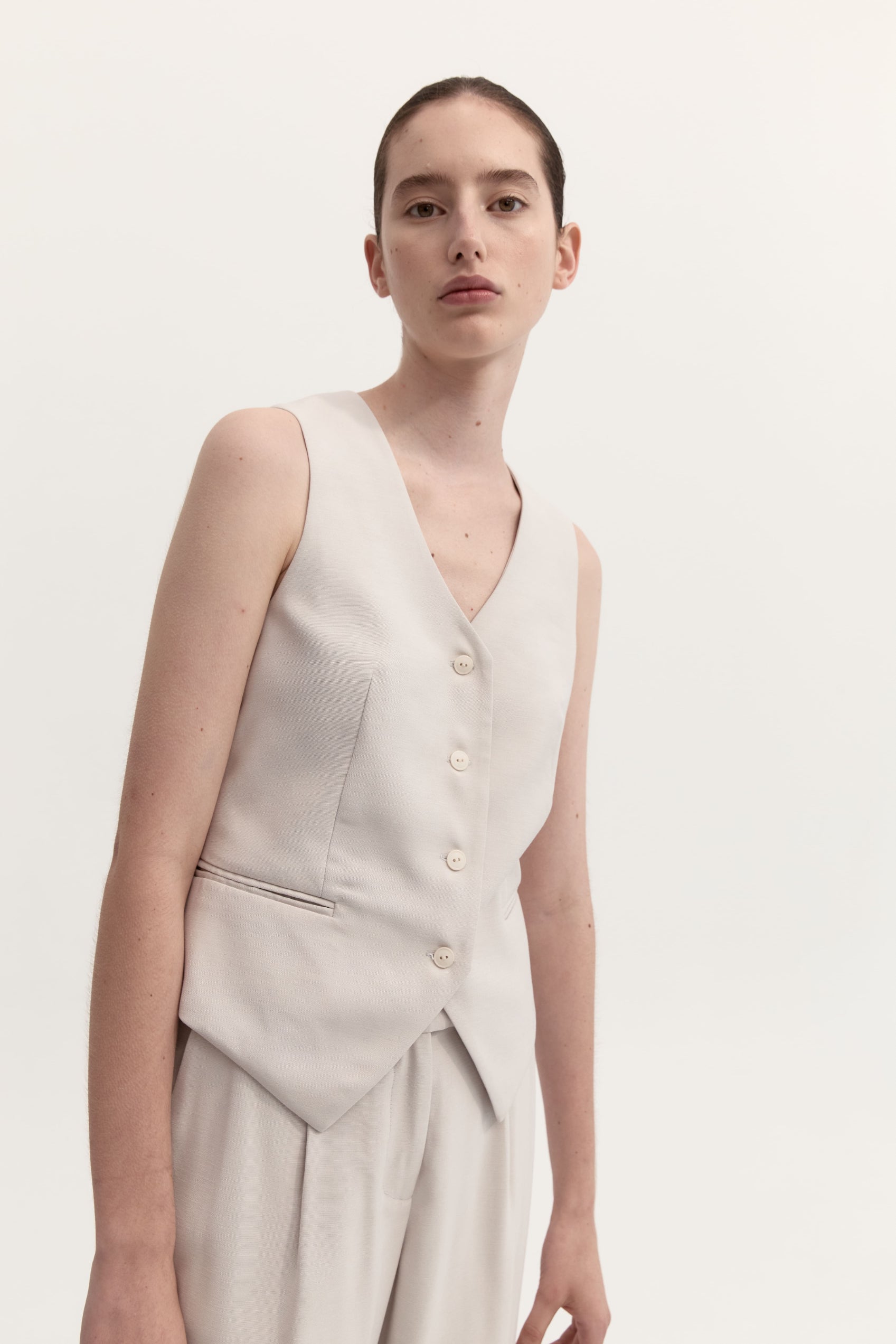 Classic tailored vest in a soft dove grey hue, crafted from a suiting blend fabrication.