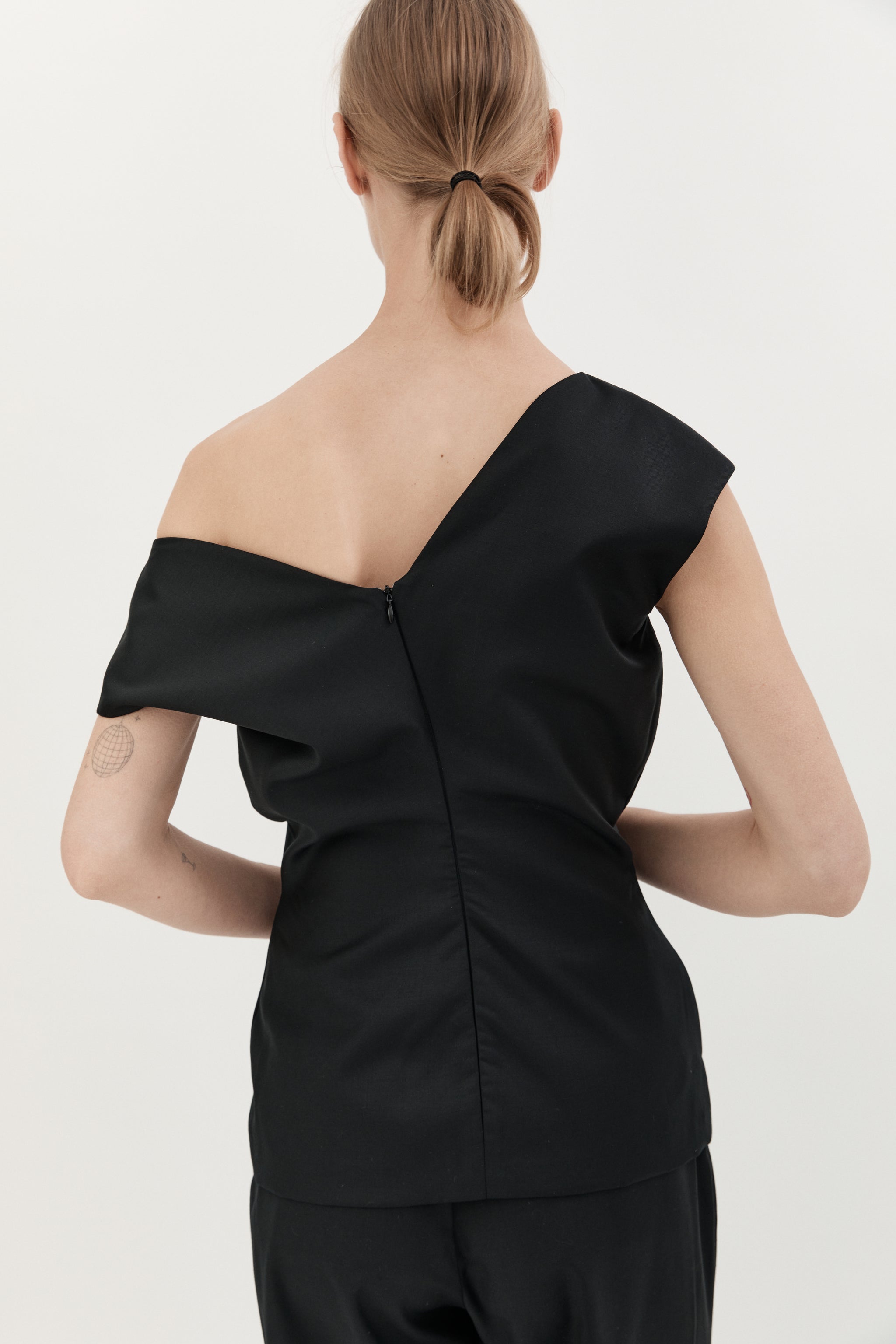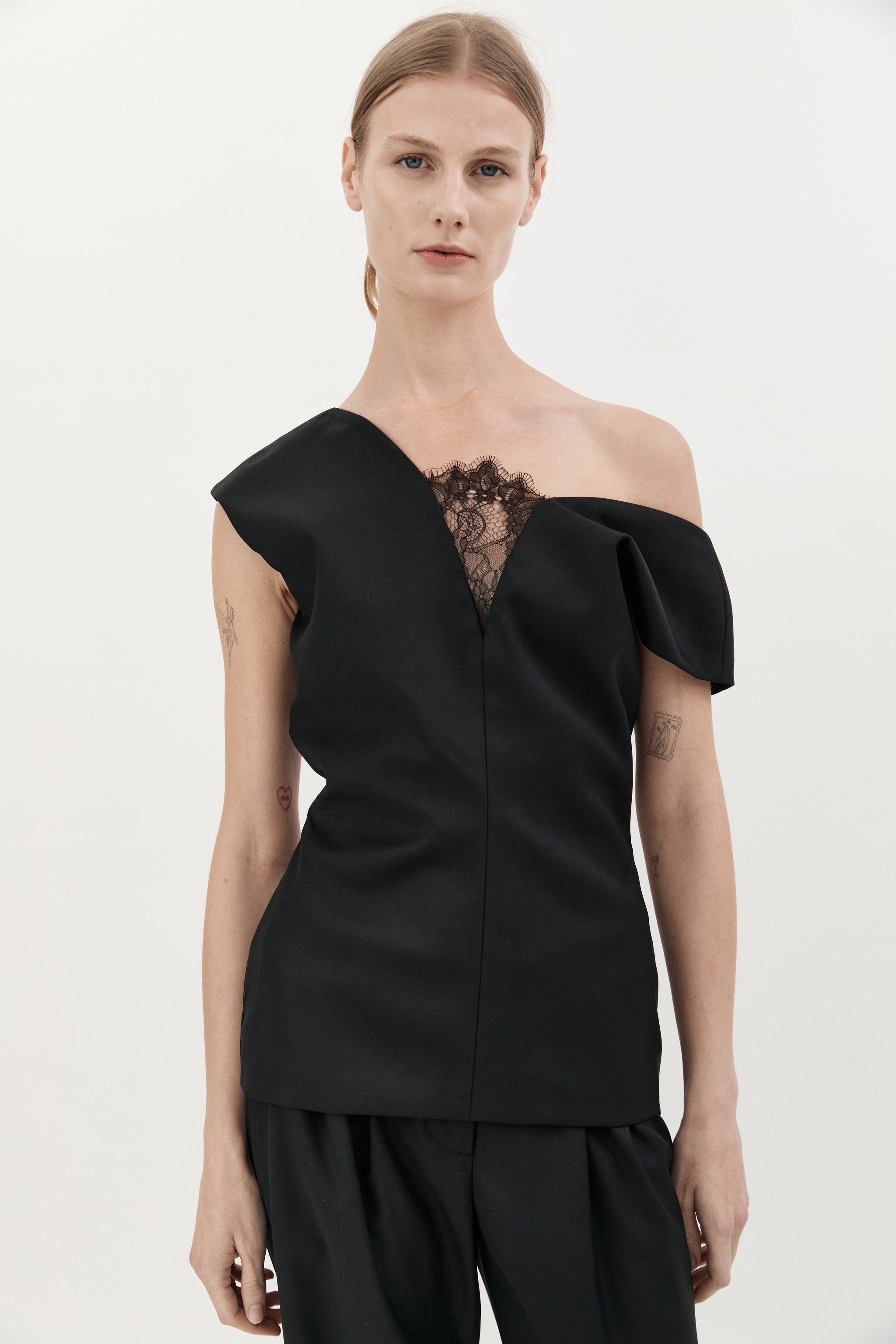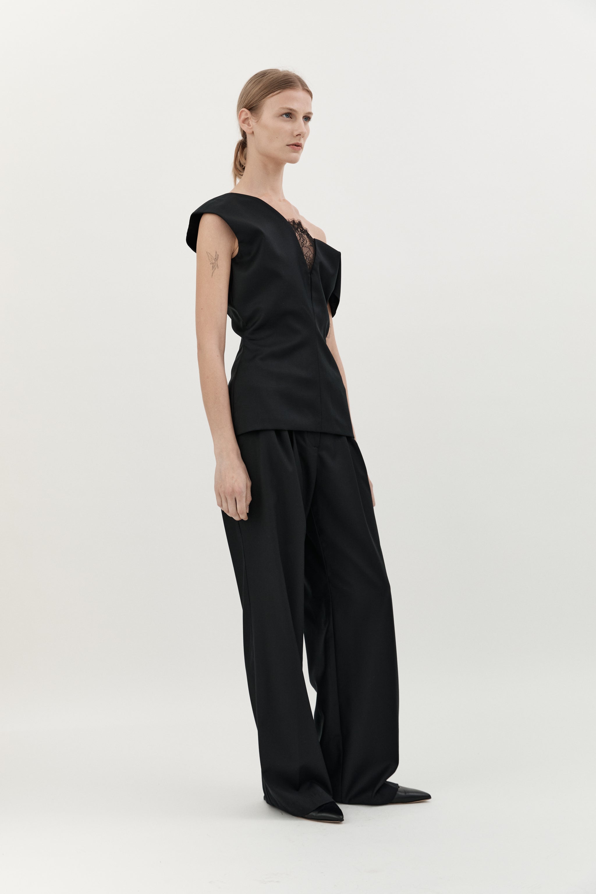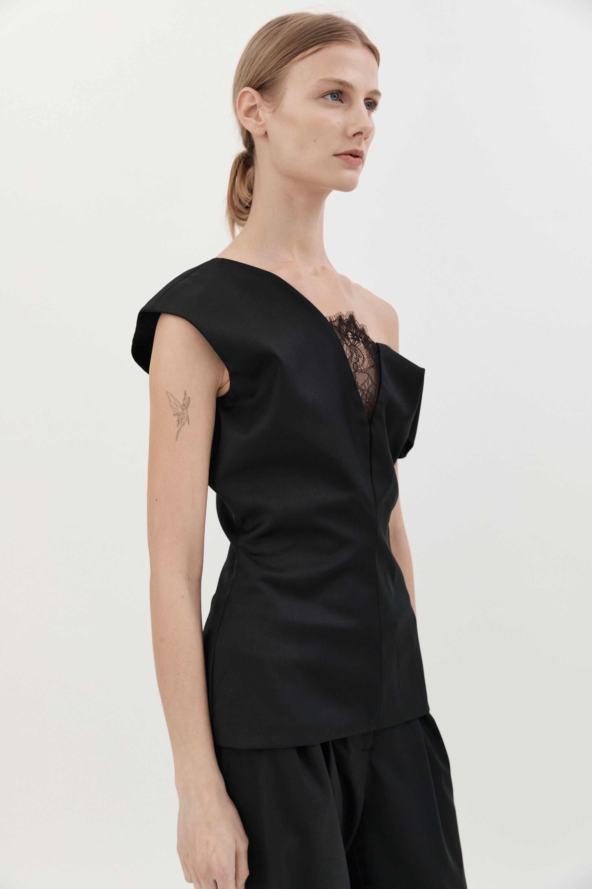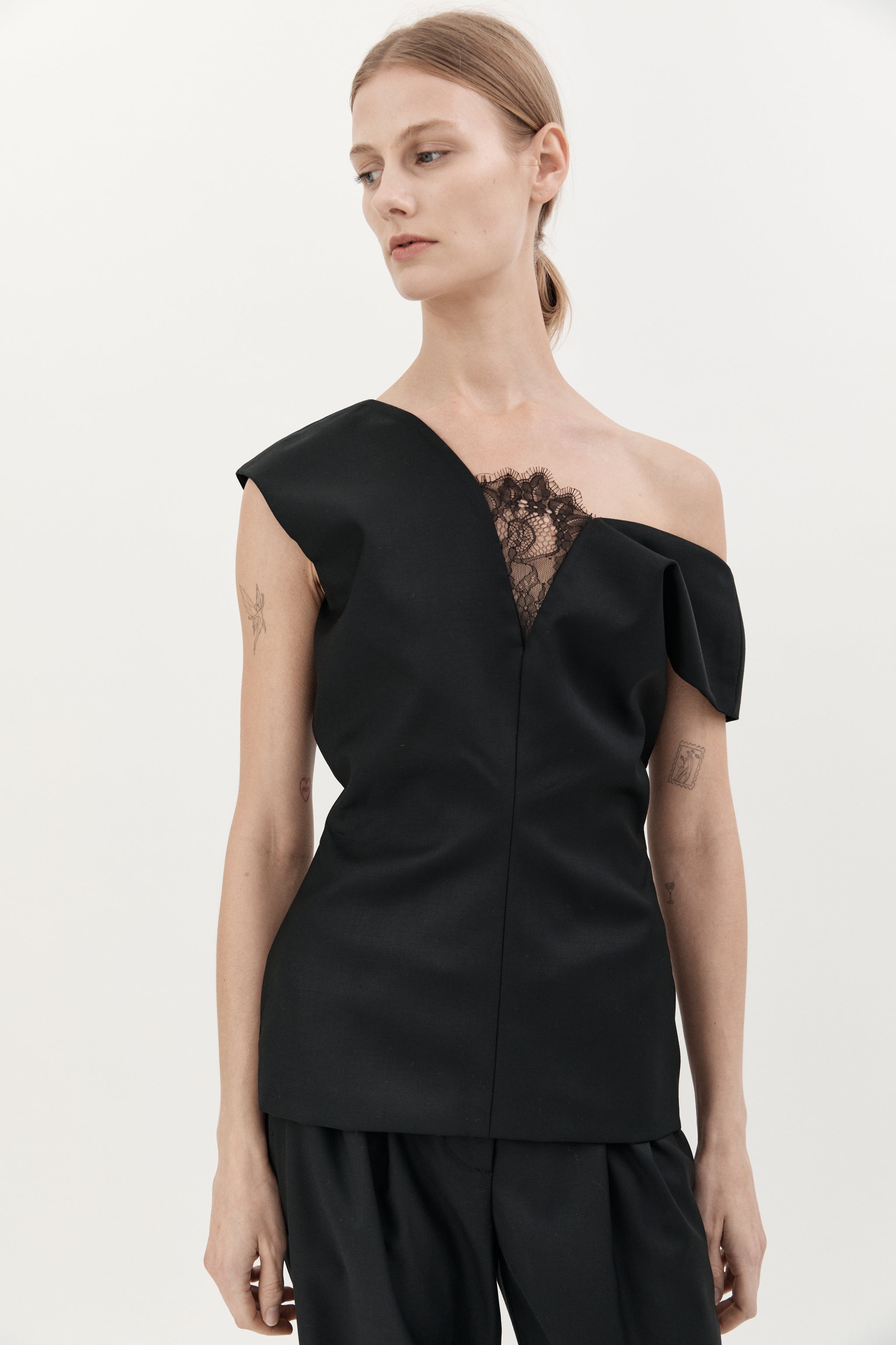 Asymmetrical neckline top with centre front seam and gathering through the waistline, intricate front lace detailing. 100% wool suiting fabrication, fully lined garment with centre back seam and invisible zipper closure.