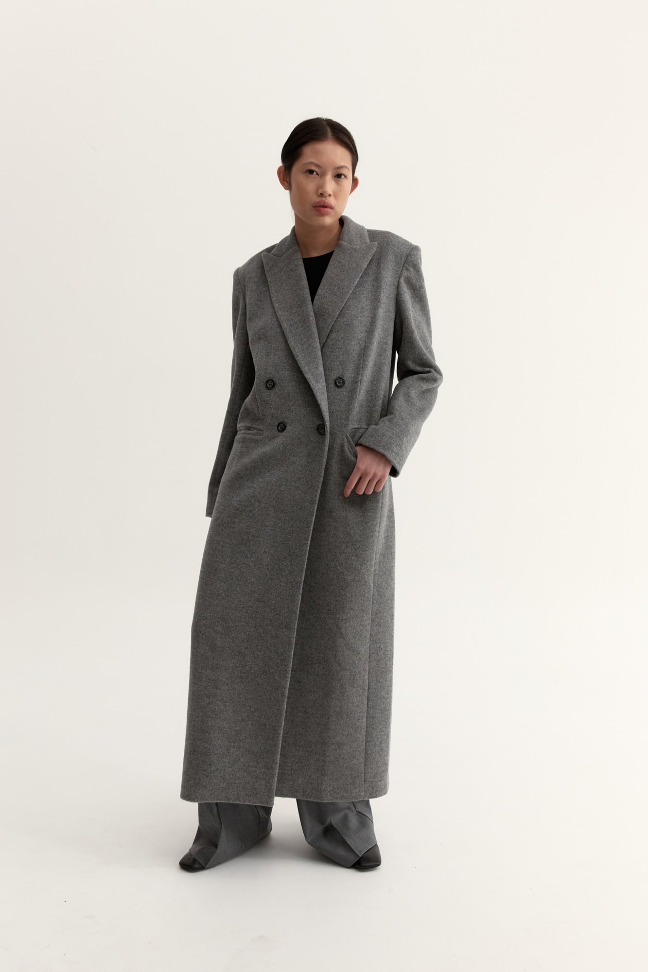 The Pernielle coat is a tailored, double breasted, full length coat featuring peak lapels, front button details, fully lined. Featuring front pockets, long straight sleeves with shoulder pads, panelling through the front and sides and centre back seam.