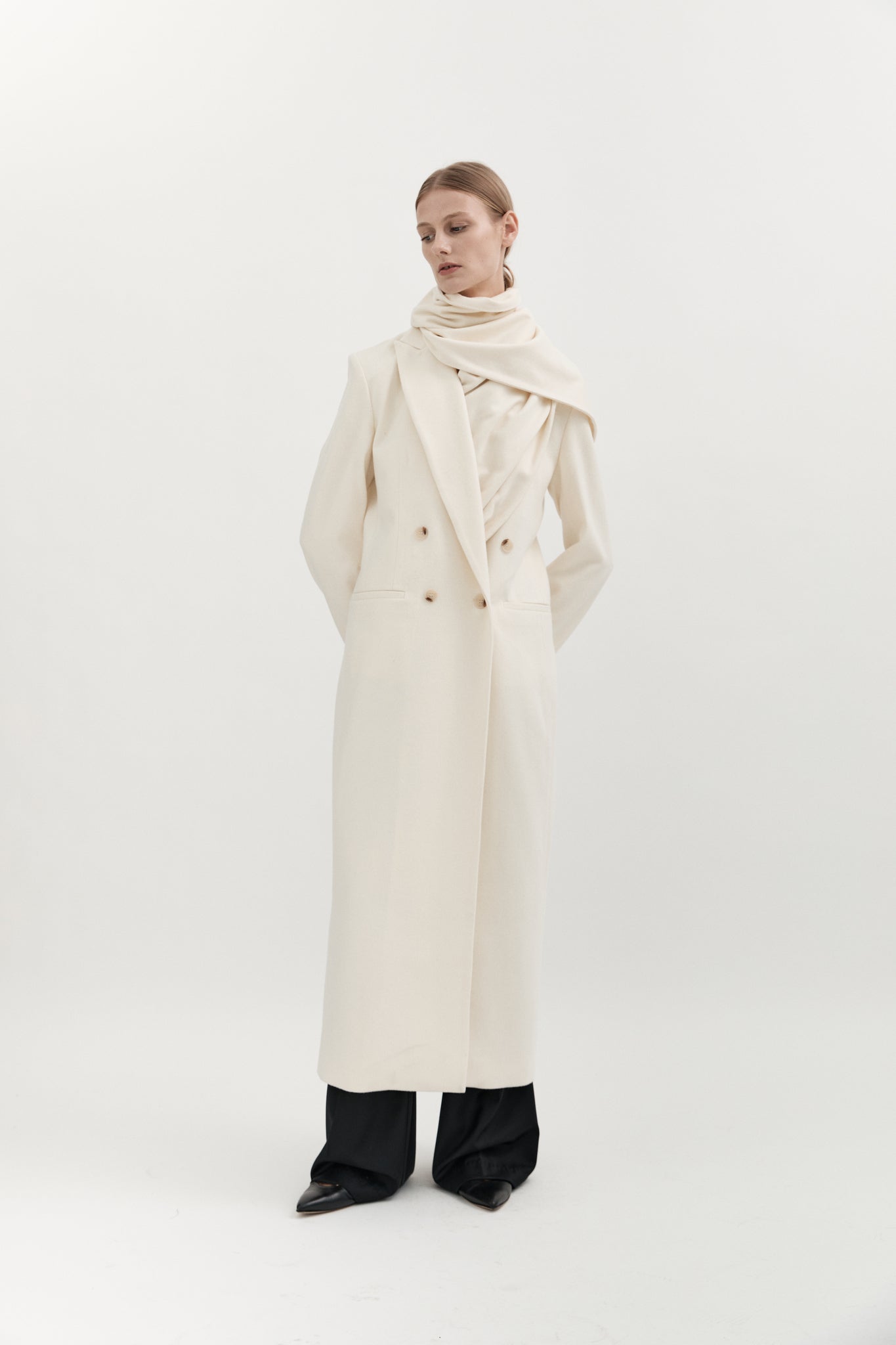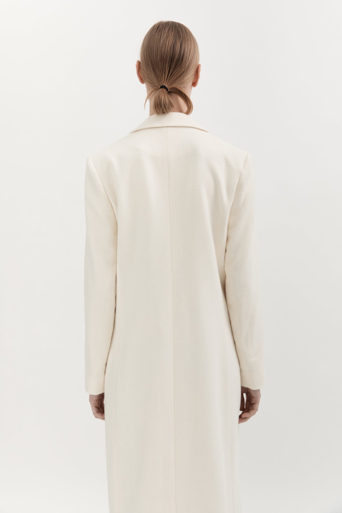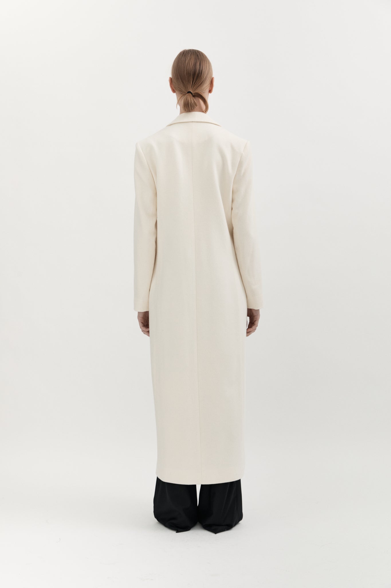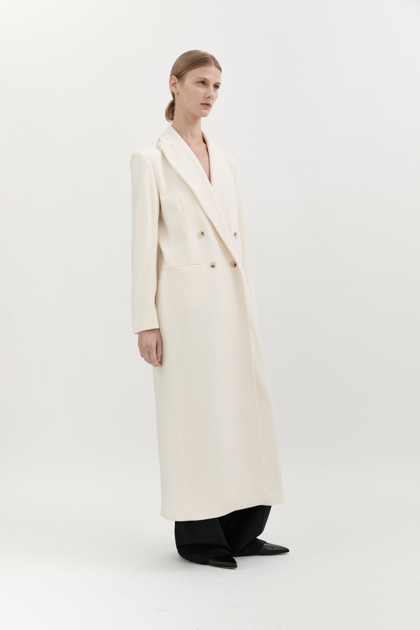 The Pernielle coat is a tailored, double breasted, full length coat featuring peak lapels, front tortoise shell button details, fully lined. Featuring front pockets, long straight sleeves with shoulder pads, panelling through the front and sides and centre back seam.