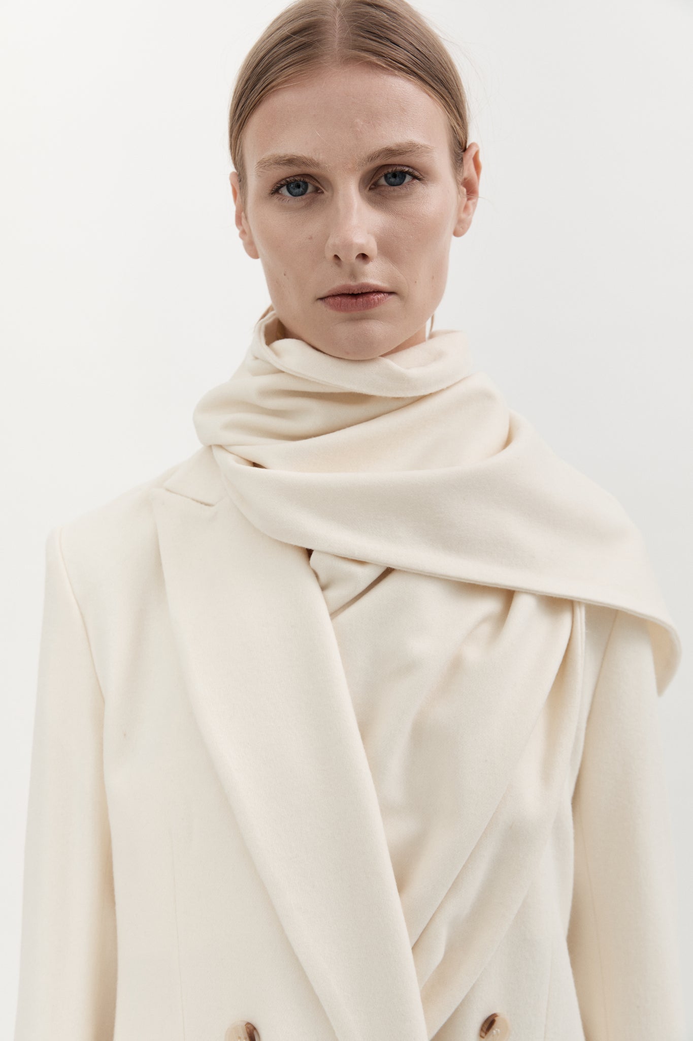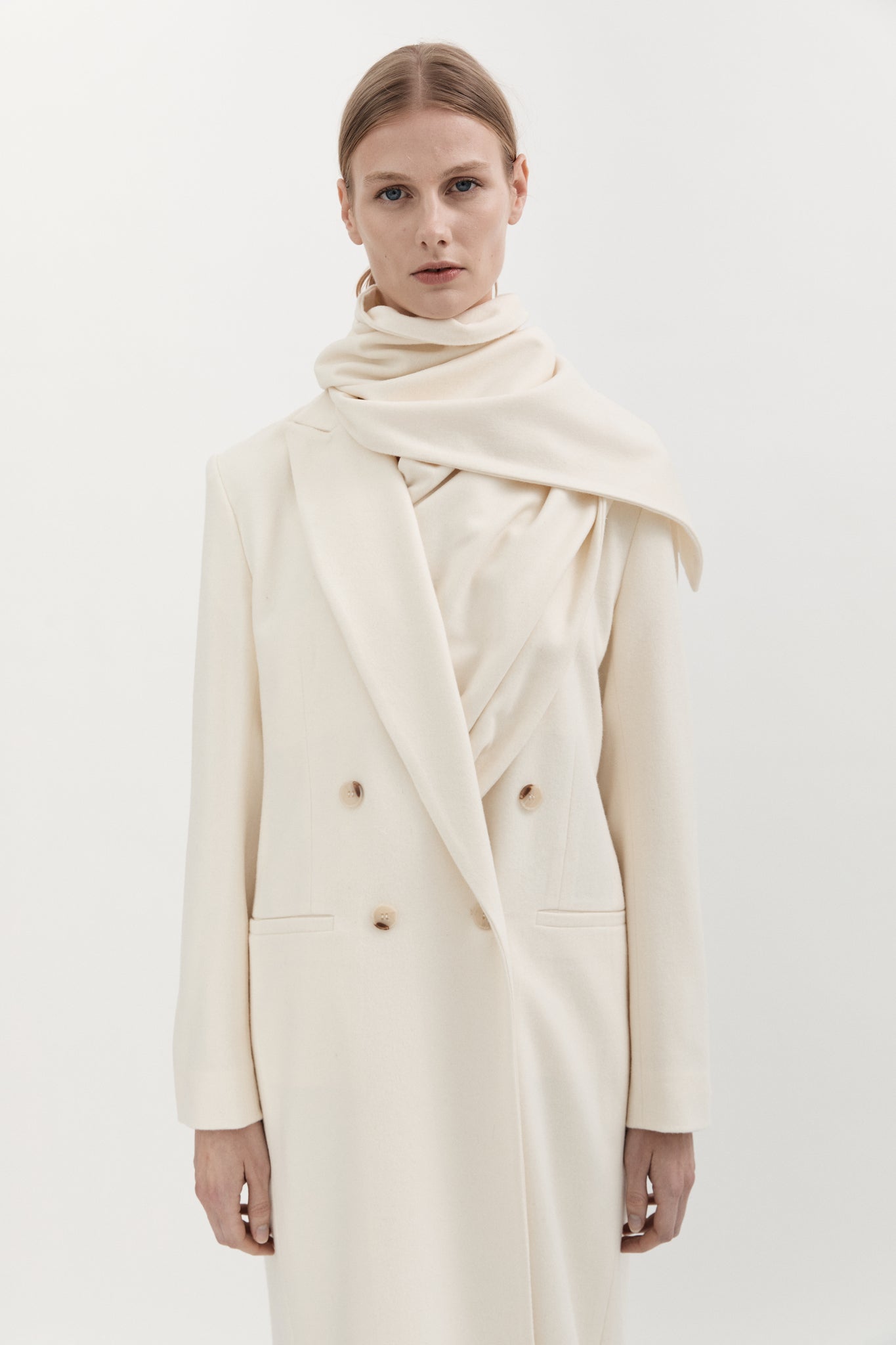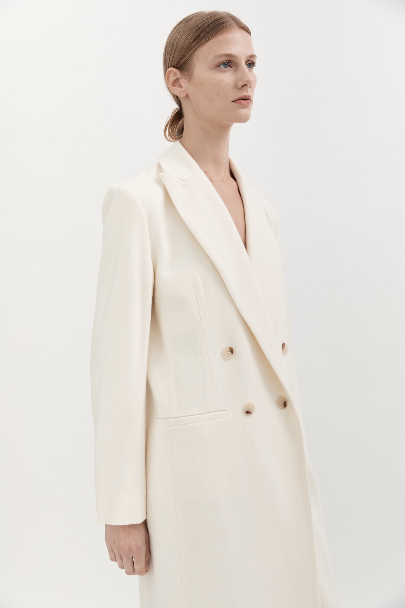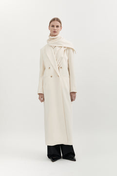 The Pernielle coat is a tailored, double breasted, full length coat featuring peak lapels, front tortoise shell button details, fully lined. Featuring front pockets, long straight sleeves with shoulder pads, panelling through the front and sides and centre back seam.